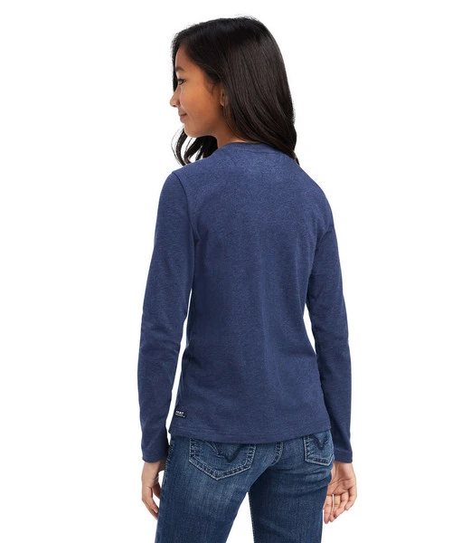 Ariat Girls Fan Club Tee Long Sleeve is perfect for young riders who love all things Ariat. The beautiful Navy Heather color and equine art has lots of charm and a playful spirit. The graphic print shows five horses, each one holding a letter card in its mouth to spell Ariat.