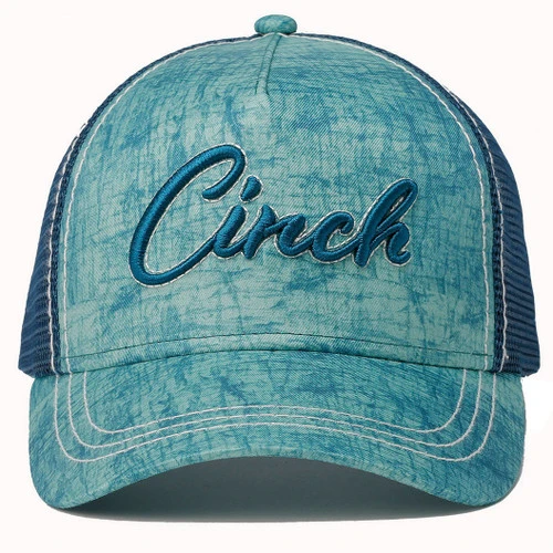 Cinch Tie Dye Trucker Hat in beautiful green and teal shades has a cool summer beach look plus authentic Western style. Casual baseball cap has a smooth poly/cotton front with subtle tie dye print. The front panel features Cinch embroidery in teal with stitched outline.