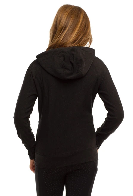 Goode Rider Girls RIDE hooded sweatshirt in Black Heather is breathable bamboo for multi-season wear. It features an adjustable hood with ties and scoop pockets. The hoodie has pink letterman jacket-style letters, with R on the right sleeve, I and D on the front, and E on left sleeve. Young riders will love the extra soft feel, total comfort, and sophisticated look of the new Girls Goode Rider RIDE Hoodie.