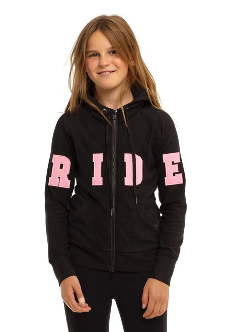 Girls Goode Rider RIDE Hoodie has upscale equestrian style and comfort in a super soft lightweight fleece with distinctive RIDE lettering. The zip sweatshirt for girls has a convenient 2-way zipper and plenty of stretch for comfort in the saddle.