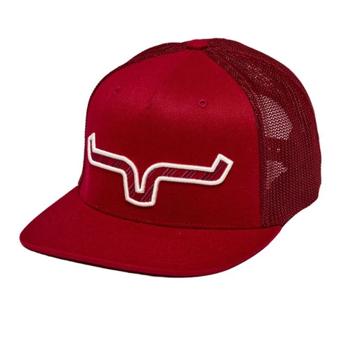 Kimes Ranch Nite Train 110 Cap features the iconic Kimes Ranch horns on the front in a unique design. The horns have a thick embroidered border around subtle low profile embroidery with diagonal stripes. The hat has a solid panel front with high quality mesh in back.