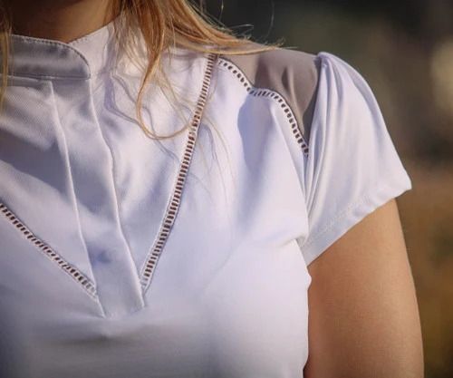 Pénélope Venise Short Sleeve Show Polo balances romantic and sporty to create a gorgeous look and comfort for the show ring. Women’s Venise Show Polo from Pénélope Leprévost has slightly pleated short sleeves and elegant Jour Venise (hemstitch) accents.