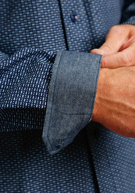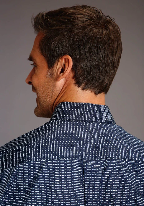 Refined yet rugged, the Stetson Blue Geo Print Shirt is a men’s Western shirt with classic good looks. The handsome navy blue with pale dots and dashes print is subdued yet unique enough for up-to-date style. This striking button down men’s shirt from Stetson will look great no matter the task at hand.