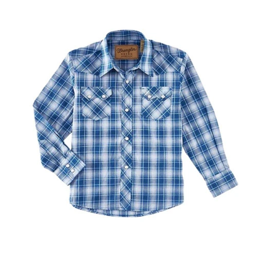 Wrangler Boys Retro Snap Plaid Shirt with sawtooth pockets has classic cowboy style in a clean, sharp design. Kids’ Western riding shirt is perfect for showing and ranch competitions. The timeless style in Indigo or Blue Dream plaid has Western yokes and handsome snaps. Both crisp plaids will look great with any jeans, but especially a dark denim wash.